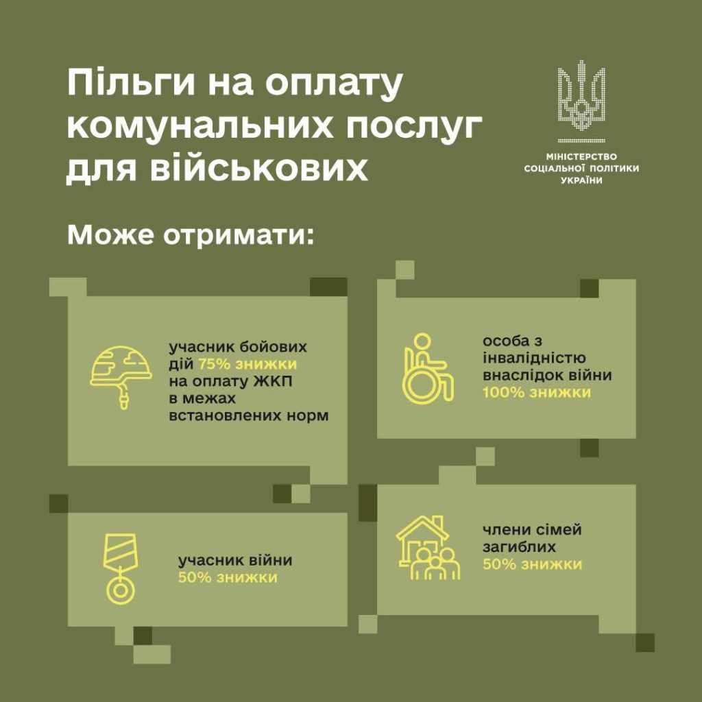 ▪️ учасники бойових дій – 75% знижки на оплату житлово-комунальних послуг в межах встановлених норм;